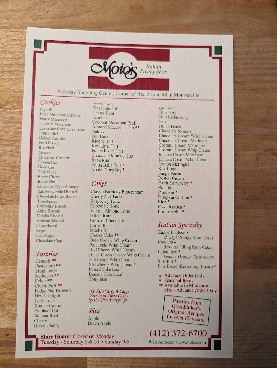 Moio's Italian Pastry Shop Menu